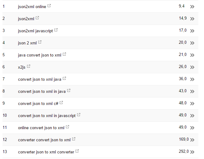 The search words I would like to improve on are the following keywords: "convert json to xml". Where the "convert" keyword can be both "convert" and "converter". Currently my site is on page 5 with these keywords. So it will be very rare for anyone to find it. My goal would of course be to be number one, even though that is mostly impossible. Some sites have been around for ages with great links to them. So for now I would be happy with just page 2.
